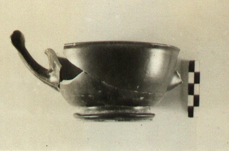| Description: | One handle and fragments of wall and rim missing. Restored in plaster. Moulded ring foot and slightly flaring rim with an indication of offset inside only. Sharply rising handles, squared at the ends. Four palmettes, surrounded by rouletting, at center of floor. Resting surface only, reserved. Good black glaze. | |