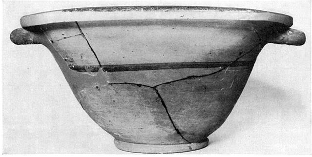 | Description: | Ring foot, slightly convex steep side wall and flat projecting rim, overhanging on its outer edge underneath. Horizontal loop handles not encroaching on rim. Restored in plaster. Poor thin brownish black glaze inside and on rim; one band outside below handles. Pale greenish clay with white grits. | |