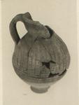Description:   Mended from several fragments; about half of neck missing. Small jug; oval body tapering to small foot and neck; triple-ridged handle from slightly flaring neck to shoulder. Upper part of body heavily grooved horizontally and diagonally.