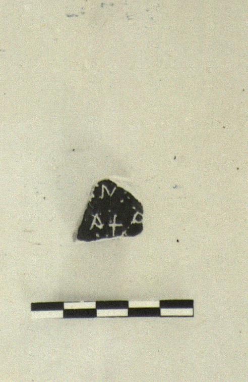 | Description: | Outside, two parts of blobs or leaves and a line; inside black glazed. Incised inside: Aristeides Lysimacho(?) | |