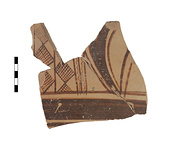 | Description: | Three contiguous fragments, near handle, from side of large open pot, probably krater; glazed inside. Below a narrow band of glaze, then a wider and narrower. In the handle zone, curved bands framing and decorating the handle. Beyond, vertical lines separating the ornament: two wavy lines, and two panels of hatched lozenges. Red-brown glaze. Submycenaean? | |