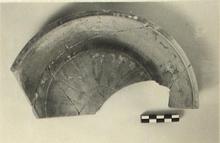 | Description: | Rather less than half preserved. Broad flat bottom, flaring walls, small horizontal rim. Decoration in white paint on floor and rim. In the center of the floor an elaborate palmette surrounded by five wheel run grooves, and a circle of dots; springing from these grooves, a circle of large elongated lotus flowers, these in turn surrounded by dots and grooves. On the rim, a row of large dots. Pinkish-buff clay, yellow at the surface. Thin pruple red glaze wash, worn. Late Roman D Ware. | |