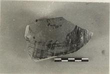 | Description: | From a large olpe decorated with a panel(?). Part of a large lion right; flame mane filled with purple; incised ribs; in field above, large round incised rosette. The glaze much peeled. | |