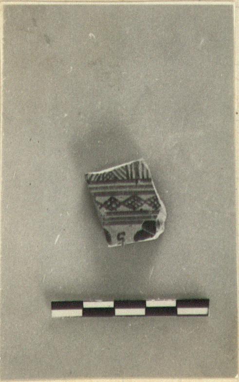 | Description: | From a cup or open pot glazed inside. Outside, a band of diminishing triangles, cross-hatched at the center; cross-hatched lozenge band between lines; incised rosettes. Yellow clay, bright red glaze outside; dull brownish red inside. Corinthian? | |