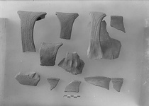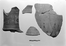 | Description: | From the rim of a coarse pitcher. Incised decoration. Two double wavy lines, above a decoration of squares with dots along their inner edges. Gritty micaceous red clay. | |