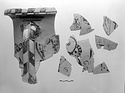 Ζ 1662: Six additional fragments, joining. These give part of the neck and shoulder. On the neck: part of the haunch and wing of a sphinx crouched to right. On the shoulder: the upper part of a mounted man, to right; head in outline, body in black, incision for arm, double spiral filler in field behind. Black glaze much flaked.