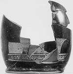 | Description: | Lower part preserved. Low ring foot. Decoration on front only: egg and dart ground line, on which preserved, left, a rectangular object; right, a wool basket. Four joining pieces added from tins give both legs and lower skirt of a woman standing right, holding in the left hand a distaff or a mirror. | |