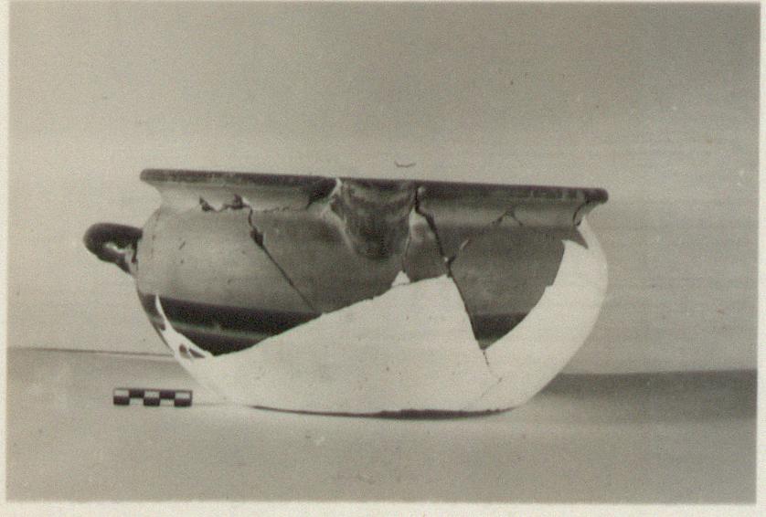 | Description: | Mended from many pieces and completed in plaster as far toward the bottom as seemed advisable. One handle missing. Streaky black glaze inside. Outside unglazed except for handle and spout and two bands below handle zone. Attic clay. | |