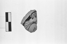| Description: | Part of a boy right; nude, but with cloak flung loosely down back and around neck. Outline of head coarsely incised, after the painting was finished. Wreath in added purple; brown dots on the cloak. A bit of purple (inscription?) at lower left edge of fragment. | |