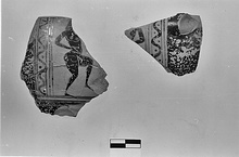 | Description: | From a small semi-open pot with two horizontal side handles and flattish shoulder; miniature hydria. In a panel on the front, bordered by two dotted wavy vertical lines, two nude male figures facing, dancing. Added purple-red. Thin wash of glaze on lower part of interior. | |