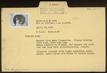 | Description: | Mended from many fragments. Pieces missing from side, base and rim. Shape similar to P 6599 but deeper and with the rim less well differentiated, inside. Interior covered with light yellowish green glaze, under which are blobs of darker green. ADDENDA P 6599: Ring foot; flaring wall with narrow vertical rim outside; broad concave rim inside. | |