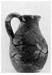 | Description: | Mended from several pieces. Small, slightly flaring plain lip; one vertical handle. No foot, but slightly concave base. Fairly fine buff clay, red glaze outside and on inside of rim. ADDENDA Badly broken in cellar storage (1939-1947); mended, but with considerable pieces missing. | |