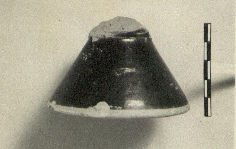 | Description: | Conical base similar to P 6689 (ΠΘ 271) but slightly smaller. None of the floor preserved. One reserved band at bottom. Metallic black glaze. | |