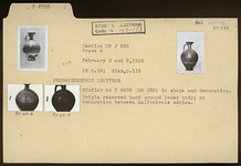| Description: | Similar to P 6698 (ΠΘ 283) in shape and decoration. Triple reserved band around lower body; no decoration between half-circle series. ADDENDA P 6698: High ring foot, squat eggy body, narrow straight neck and flaring round lip. One handle, shoulder to below lip. | |