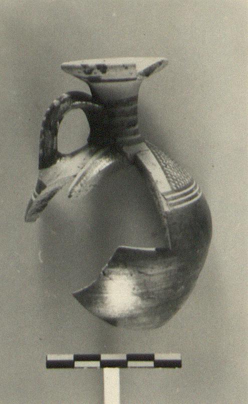 | Description: | Similar to P 6702 (ΠΘ 287) but smaller. On shoulder above triple reserved band, crosshatched triangle. Metallic black glaze. ADDENDA P 6702: Similar to P 6698 (ΠΘ 283) but smaller and of heavier fabric. P 6698: High ring foot, squat eggy body, narrow straight neck and flaring round lip. One handle, shoulder to below lip. | |