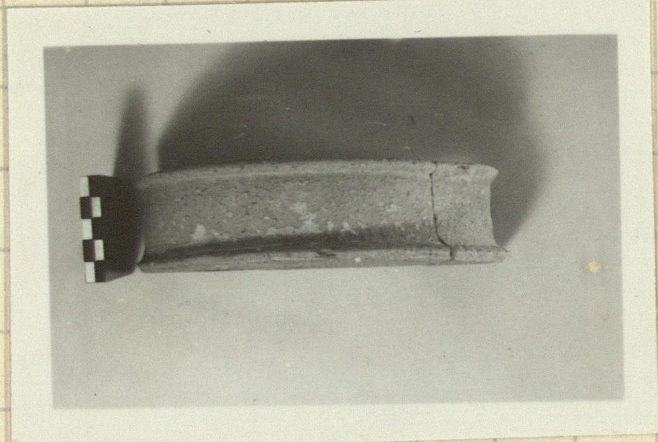 | Description: | Flat-bottomed circular stand for round-bottomed pots; straight side wall set back from edge of floor; projecting rim. Micaceous red clay with large white grits. Traces of creamy clip. | |