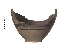 | Description: | Preserved from the low ring foot to the start of an inward curve at the shoulder. Part of the foot and all of the bottom inside it, missing. Around the body, at the point of greatest circumference, a row of concentric circles. Below, a broad band between two narrow bands above and two below. Streaks of glaze, from the ornament of the horizontal handles (?) run diagonally across these bands. Fine-pinkish buff clay. | |