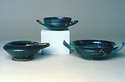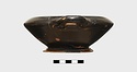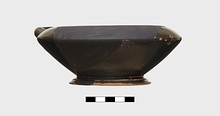| Description: | About one-quarter of the body with most of the rim missing. Flaring ring foot, grooved on upper face. Lower and upper body meet at sharp angle; the upper body slightly convex with a turned down rim. One horizontal loop handle. Entirely covered with black glaze, except reserved band where rim turns down. Inside glazed nearly to shoulder; rings and dot underneath. | |