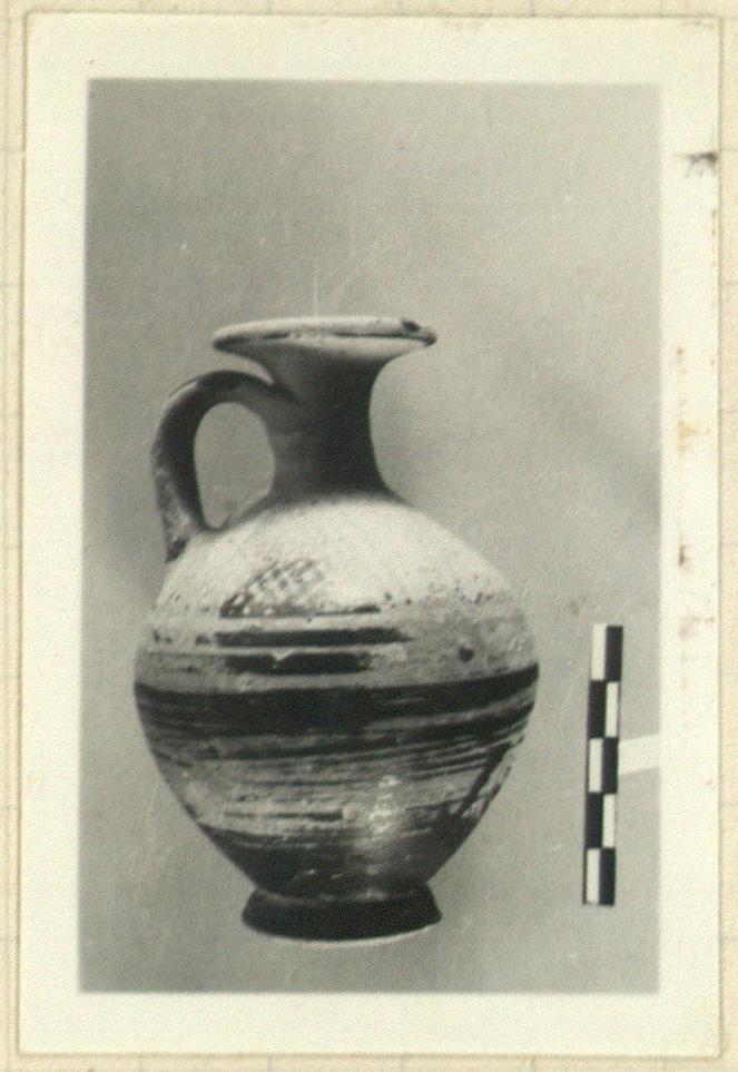 Description:   Intact. Round mouth, barred lip and handle and neck. Three hatched triangles on shoulder. Three lines around body; black below. Slightly flaring foot.