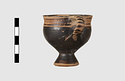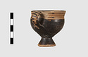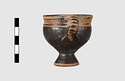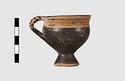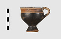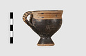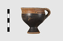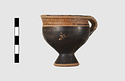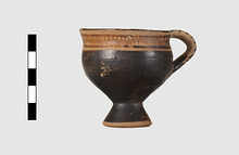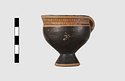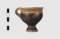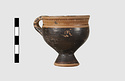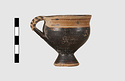 | Description: | Intact. Reserved lip, ornamented with zigzg between bands; inside lip reserved edge and one black band. Reserved dot on center of floor. Banded handle. Flaring foot. Glazed black inside and out. | |