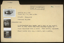 Description:   A one-handled cup; bands and a star on the handle, dots on rim; black body with reserved square in front decorated with a cross. Flat bottom, unglazed.