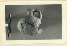 | Description: | Fragments missing from wall; perhaps incomplete when buried? Squat shape. Rounded bottom, small neck and flaring lip; broad band handle, lip to shoulder. Coarse buff clay with bits. Handmade. | |