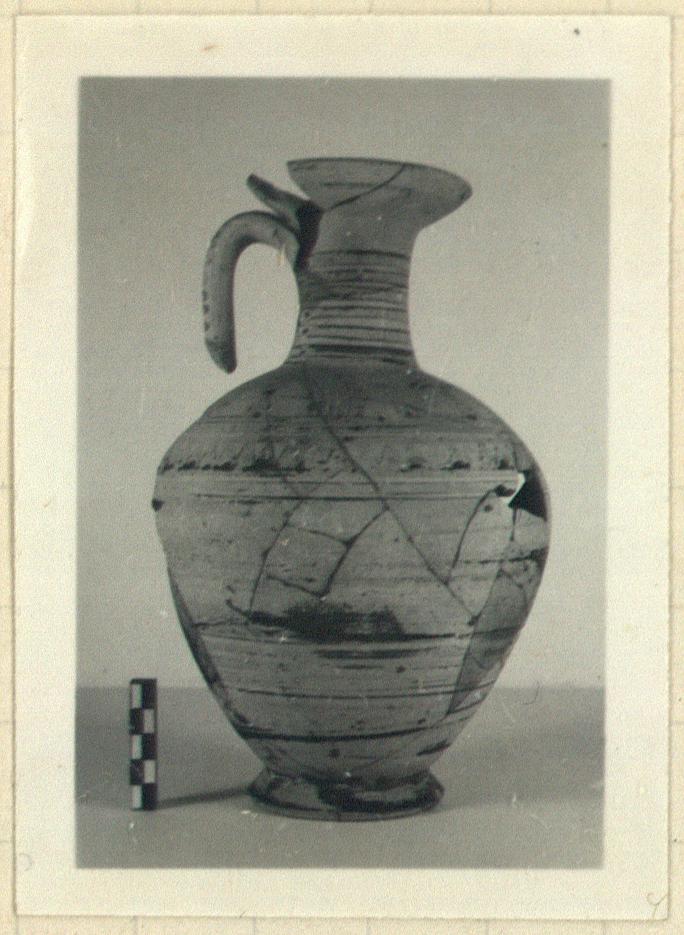 | Description: | A few pieces missing from handle and body. Round mouth, handle, neck all banded. Four semicircles compass-drawn, about solid hour-glass on shoulder; tooth pattern below; solid black lower part, except for four reserved lines near the bottom. Black glaze, much peeled; fragments of the vase burned after breaking. | |