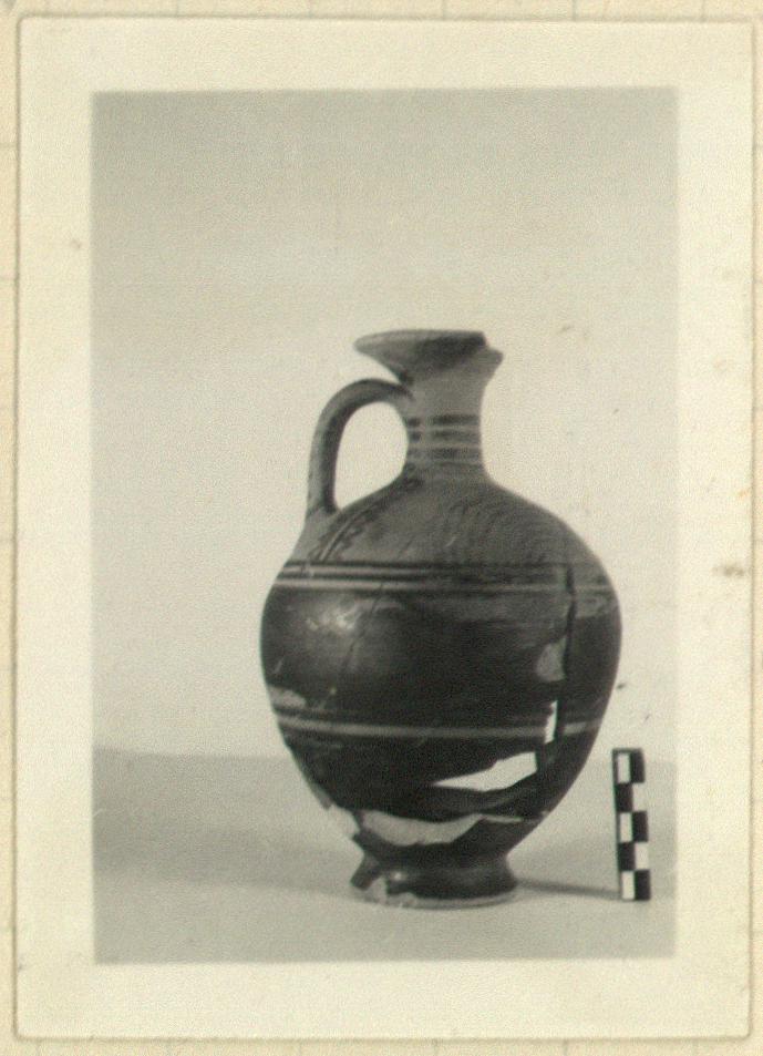 | Description: | About half of lip and large pieces of lower body missing. Banded neck and handle. Shoulder ornament, two sets of concentric semicircles, not compass-drawn, separated by vertical divisions, two lines between zigzags; then two bands. The body black, except for one reserved line. Burned; the glaze partly peeled. | |