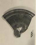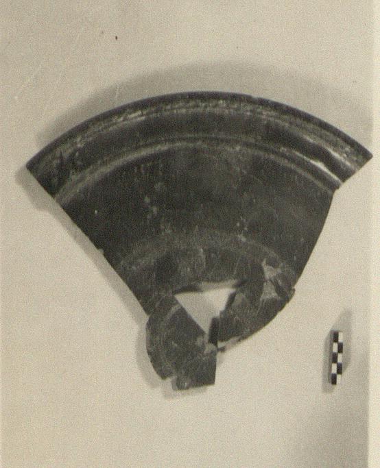 | Description: | About one-quarter of a very large plate preserved. Ring foot broken off; plate mended in antiquity with lead clamps, of which one remains. Flat shallow floor with broad projecting rim, moulded at the edge, and stamped: palmettes, then cable pattern. Two grooves around outer edge of floor. Around the center of the floor, two broad bands of crisscross rouletting; between them, extremely large stamped palmettes. <graphic> Very micaceous gray clay, reddening at the edges; black glaze over all. Cf. Agora XXXII, p. 26, n. 75. | |