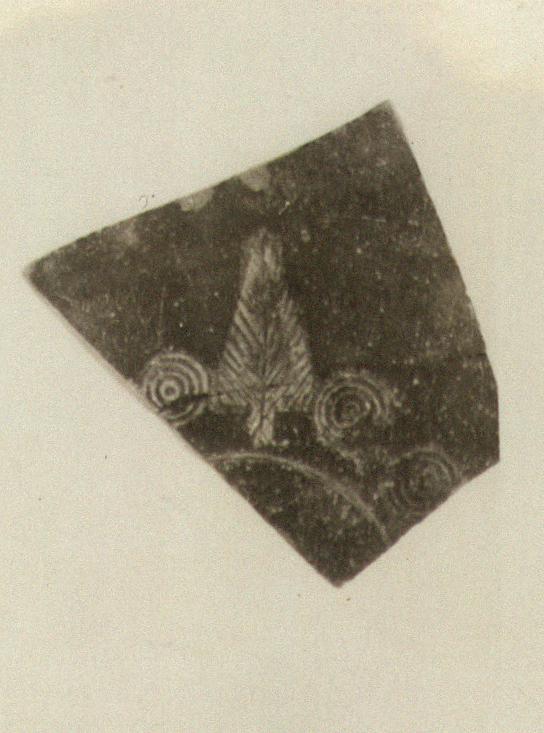 | Description: | Fragment from near center of Late Roman C plate. Stamped with palm leaf and two sets of concentric circles on one side, one on the other. Light red clay; thin red wash. | |