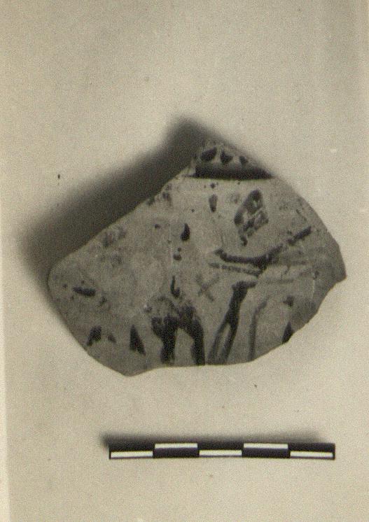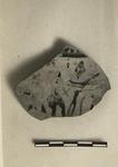 Description:   From a large open pot with straight rim, krater or large bowl, glazed inside. On rim, vertical strokes. Below, part of man driving chariot. Filling ornament.