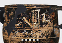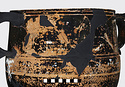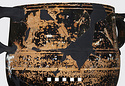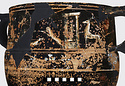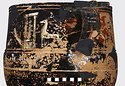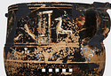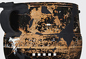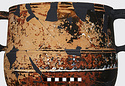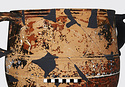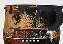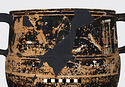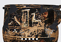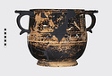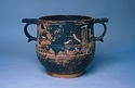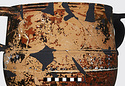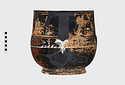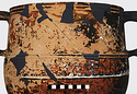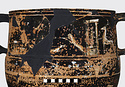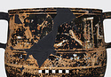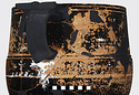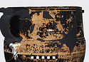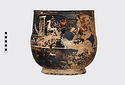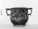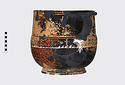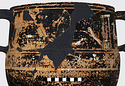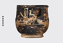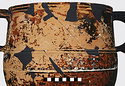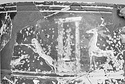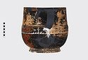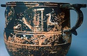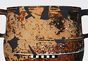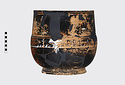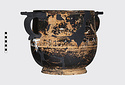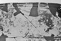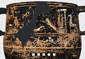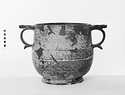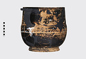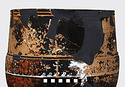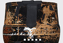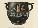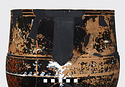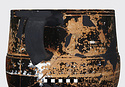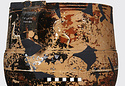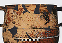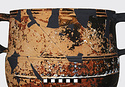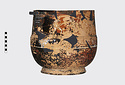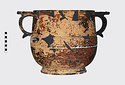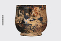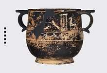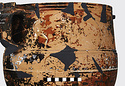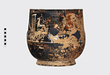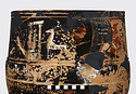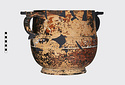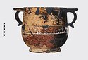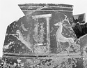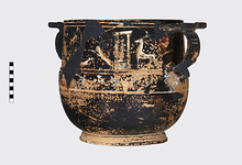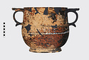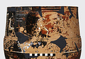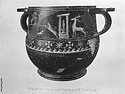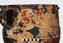 | Description: | One handle missing, and fragments from body and rim. Heavy moulded ring foot; slightly bulging lower wall, nearly vertical upper wall. Vertical handle with large thumb-rest. Two wheel run grooves where upper and lower wall meet; lower down, a scraped groove; below the plain lip, two scraped grooves. Painted decoration in white with added yellow over. Around upper wall, a hunting scene near a sanctuary: altar to left, statue in shrine to right of hunter with dog attacking feline. Below, conventional decoration of stars and crosses above wave pattern. Below the scraped groove, a graffito inscription: <graphic> | |