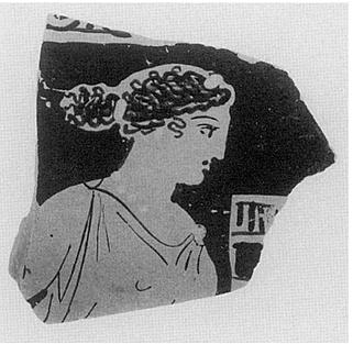 | Description: | Broken all around. The head and shoulders of a draped female figure in profile, facing right; the hair is drawn over the brow and tied in back in a projecting bunch of loose curls, rendered by snaky lines. The features are small and delicate. The woman is wearing a chiton caught in points on the shoulders. Applied dots of clay are used to form the hair ornaments, earrings and necklace. Attic clay. | |