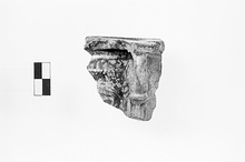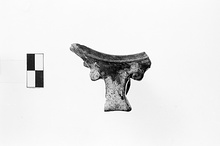 Description:   One spurred handle and part of rim. On body outside, vegetal pattern in relief.
