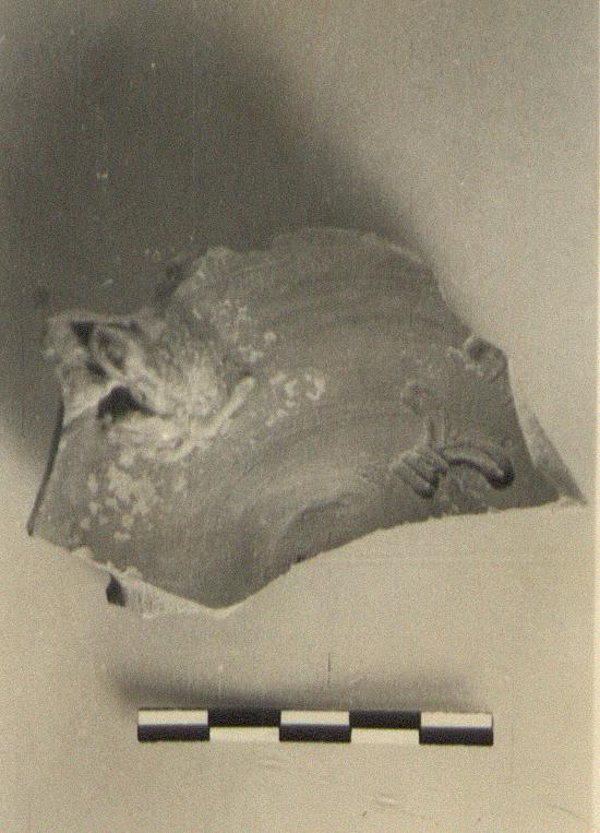 | Description: | Part of plate or bowl with ring foot. On floor, a frog(?) in relief and a stamped ornament. Gray clay; brownish-red glaze. | |