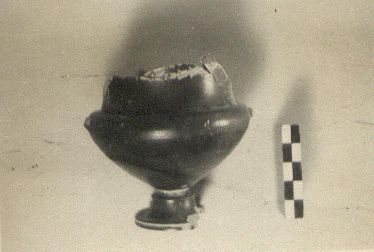 | Description: | All of the rim, and much of the upper wall missing, with fragments from body and foot. The lower attachments of both handles remain. Deep lower body; slightly convex upper wall set in from the body. Neatly moulded foot, similar to that of P 6947 (ΠΘ 733), but more carefully made. A scraped groove at its attachment to the body, around its lower edge, and underneath. On both sides of the wall, neatly painted in added clay, a garland of pairs of pointed leaves alternating with pairs of berries. Fine fabric; glaze dull but firm. Cf. Agora XII, no. 721. | |