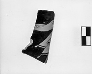 Description:   From the wall of a large pot (column krater?); slight vertical and horizontal curves. Part of a figure moving right with right arm extended behind; black bordered drapery below; probably a girl in a Doric chiton. On the surface of the extended arm, two lines with cross-strokes; part of a thyrsos held in the hand(?). Partial relief contours.