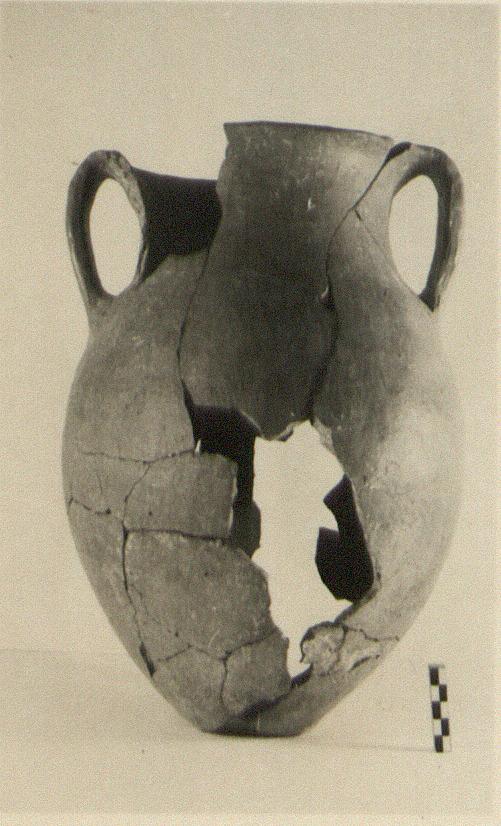 | Description: | Mended from many pieces; a number of not very important fragments missing, with most of the flat bottom. Handmade; red to grayish clay. Cf. Desborough (1952), p. 11 (under P 6997). | |