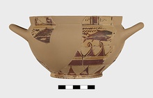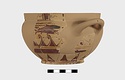 | Description: | Much missing, but profile complete. Several fragments do not join. Low ring foot; rounded body; straight lip. Maltese cross on bottom outside. Dots on foot. Above foot, rays, alternating black and purple; then a purple band; then more rays ending in hooks forming a wave pattern, purple. Above, a row of fishes swimming right, their lower bodies filled with purple, interior details incised. Above, zigzags and dot rosettes. Rim divided into panels and inscribed in glazed letters: <graphic> Inside glazed red, with three horizontal purple bands. At center of floor, hooked wheel in reserved center; bands around. Pattern on inside of rim same as on outside, but with double spirals instead of letters between triglyphs. | |