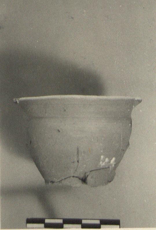 | Description: | Both vertical handles missing and chip from bottom. A squat cup with slightly rounded walls and lip slightly flaring. The bottom left rough from the wheel. Pinkish-buff clay, unglazed. | |