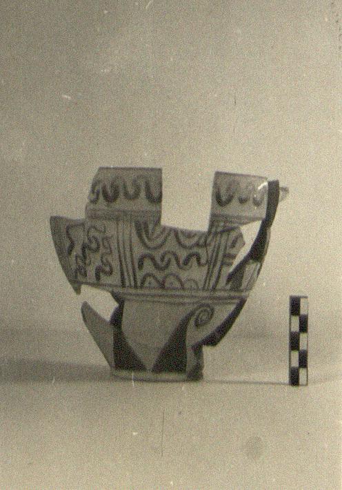 | Description: | Mended from many pieces; much missing from rim and walls. Various small fragments do not join. Slender flaring shape; low ring foot. Wavy pattern, left, on rim; below, panels filled with diagonal wavy lines and running dog; horizontal running dog, wave pattern, half circles, and the like. Above the foot, rays, alternate ones ending in spirals. Glaze black to reddish-brown. | |