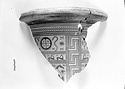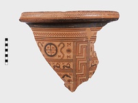 Rounded rim with reserved band decorated with crossed horizontal zigzags, the resulting lozenges dotted. The same between bands below the rim. Rectangular panels separated horizontally by triple bands, vertically by a hatched vertical maeander, running left (down). Top panel: at center, four-spoked wheel, fringed, with hourglasses beween spokes; dotted snake on each side; filling ornament, hourglasses and star. Below, a band with bearded goats with reserved and dotted eyes. Below part of a large panel with a horse right, and filling ornament.