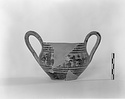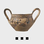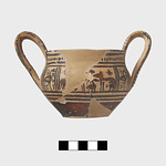Description:   Fragments of rim, wall and bottom missing. Black to handle zone; three reserved bands along its lower edge. In handle zone, front and back, three panels separated by triple vertical lines. Outer panels: birds, with dot rosettes; in central panels, horses and birds, filling ornament of stars. On rim, row of dots with lines above and below. On handles, horizontal bands and St. Andrew's cross. Two reserved bands inside lip.