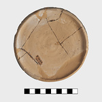 Description:   Fragments missing from rim. Flat lid with downward turned flange under edge. Short knob handle, flat on top. On upper surface: diagonal hatching around edge, and four sets of triple reserved rings. Bands on stem of handle; on top of handle, eight-armed cross, the arms outlined.