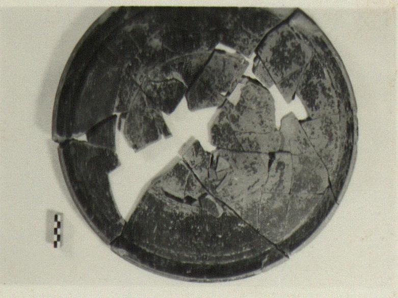 | Description: | Mended from many pieces; fragments of floor missing. Rim vertical outside, moulded above and below; flat floor; low ring foot. Wheelrun grooves on floor. Gray clay; dull black glaze, much worn. | |