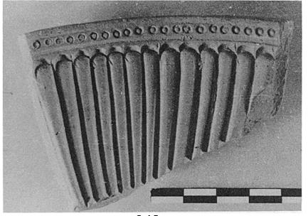 | Description: | From the upper part of a bowl, cut(?) at the left side. Three grooves on outside. Inside, a crisp mold for a bowl of the long-petalled variety, with dots in a groove around the rim. Cf. P 20518, jewelled rim. | |