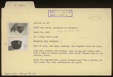 | Description: | Much of wall and base missing. One fragment does not join. Restored in plaster. Side wall covered with fronds. Zone of egg and triple dart with a band of double spirals, from which flowers rise at intervals, above. About the egg and dart, glaze scraped away from a groove, as also below rim. Good workmanship and glaze. | |