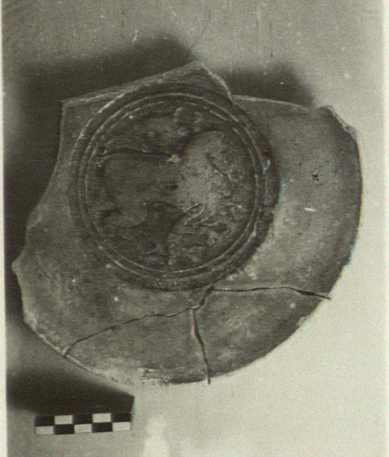 | Description: | Several pieces of rim missing. Shallow plate with low base ring and a slight upward curve for the lip. Central medallion bordered by two scraped circles, containing an heraldic animal, reserved, against a scraped background. Coarse pinkish-buff clay; pale green glaze. Exterior entirely covered with white slip. | |