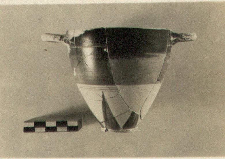 | Description: | Slender shape. Fragments missing from sides, restored in plaster. Low ring foot; rays above. Above rays, three fine glazed lines; the upper body glazed. Handle zone set off below by fine line of added white, and handle panels by fine vertical white lines. Glaze black to red; red peeled inside, and much of the black gone about the rim. Protocorinthian. | |