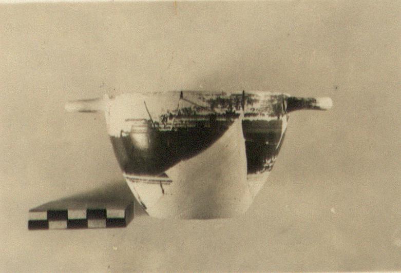 | Description: | Base missing, and much of walls. Restored in plaster. Similar to P 7144 in shape and decoration; but handle zone set off below by triple line of added purple, with a white line above and below. Glaze brownish-black, much peeled. Protocorinthian. ADDENDA P 7144: Low ring foot; rays above. Above rays, three fine glazed lines; the upper body glazed. Handle zone set off below by fine line of added white, and handle panels by fine vertical white lines. | |
